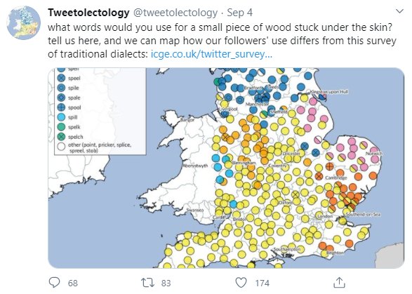 @Tweetolectology maps fascinating details about dialects in the British Isles. Who can resist looking into the answers to questions like “Do you pronounce the ‘w’ in words like ‘woman’ and ‘wood'” or what word do you use to describe being very cold? (Hint: ‘starving’ is an accepted term.)