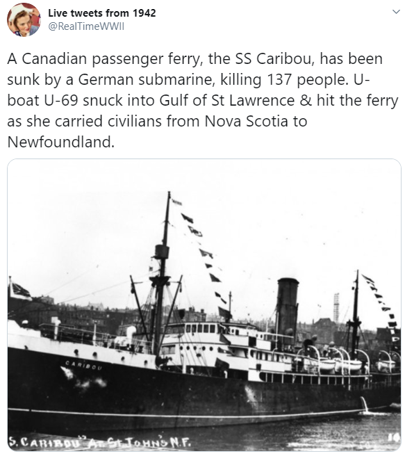 @realTimeWWII posts several tweets a day following the chronology of the Second World War. The timeline is currently in 1942. Check out this Tweets about a U-boat attack in Canadian waters: