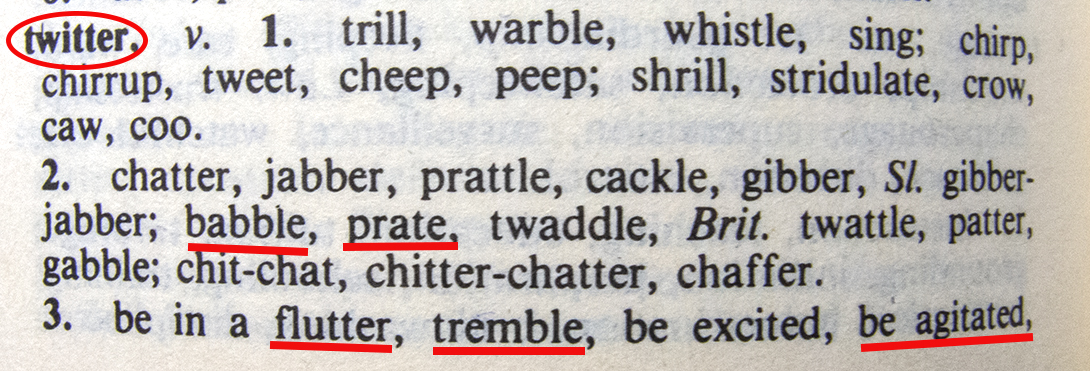 I confess. I like Twitter. So what if The Synonym Finder lists these equivalents for the word “twitter”?